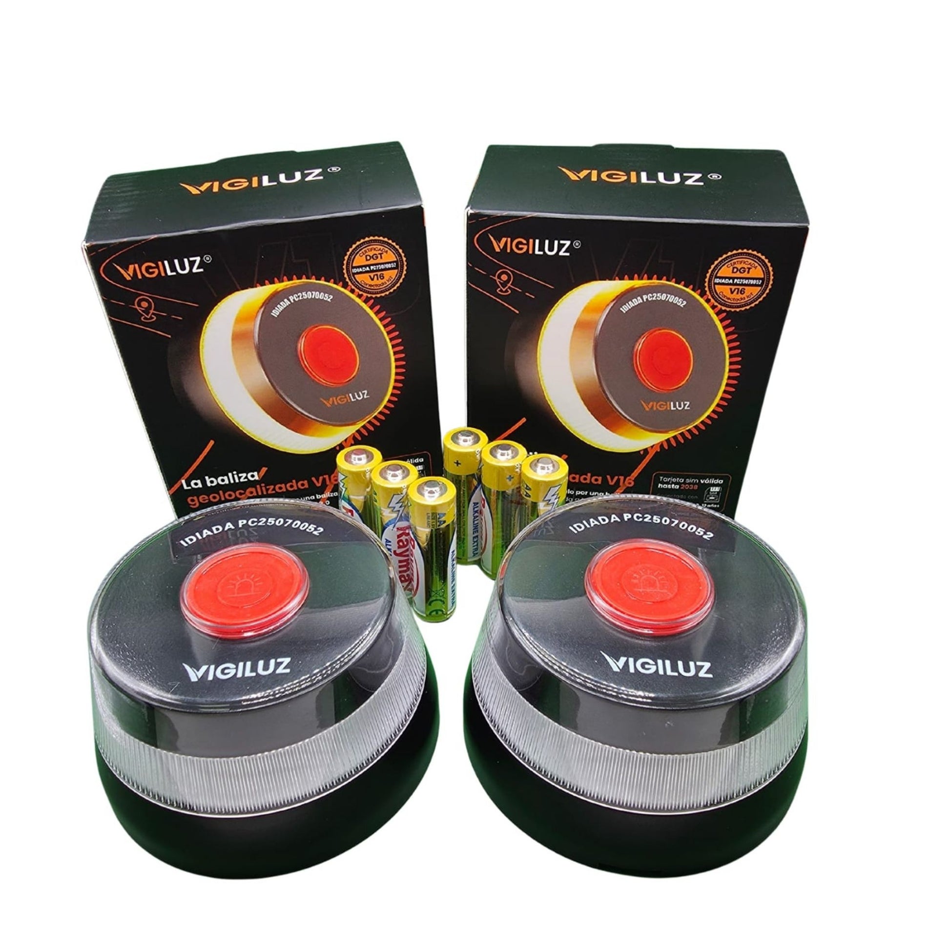 Este pack incluye 2 balizas Vigiluz V16 Connect con todas las prestaciones oficiales:
